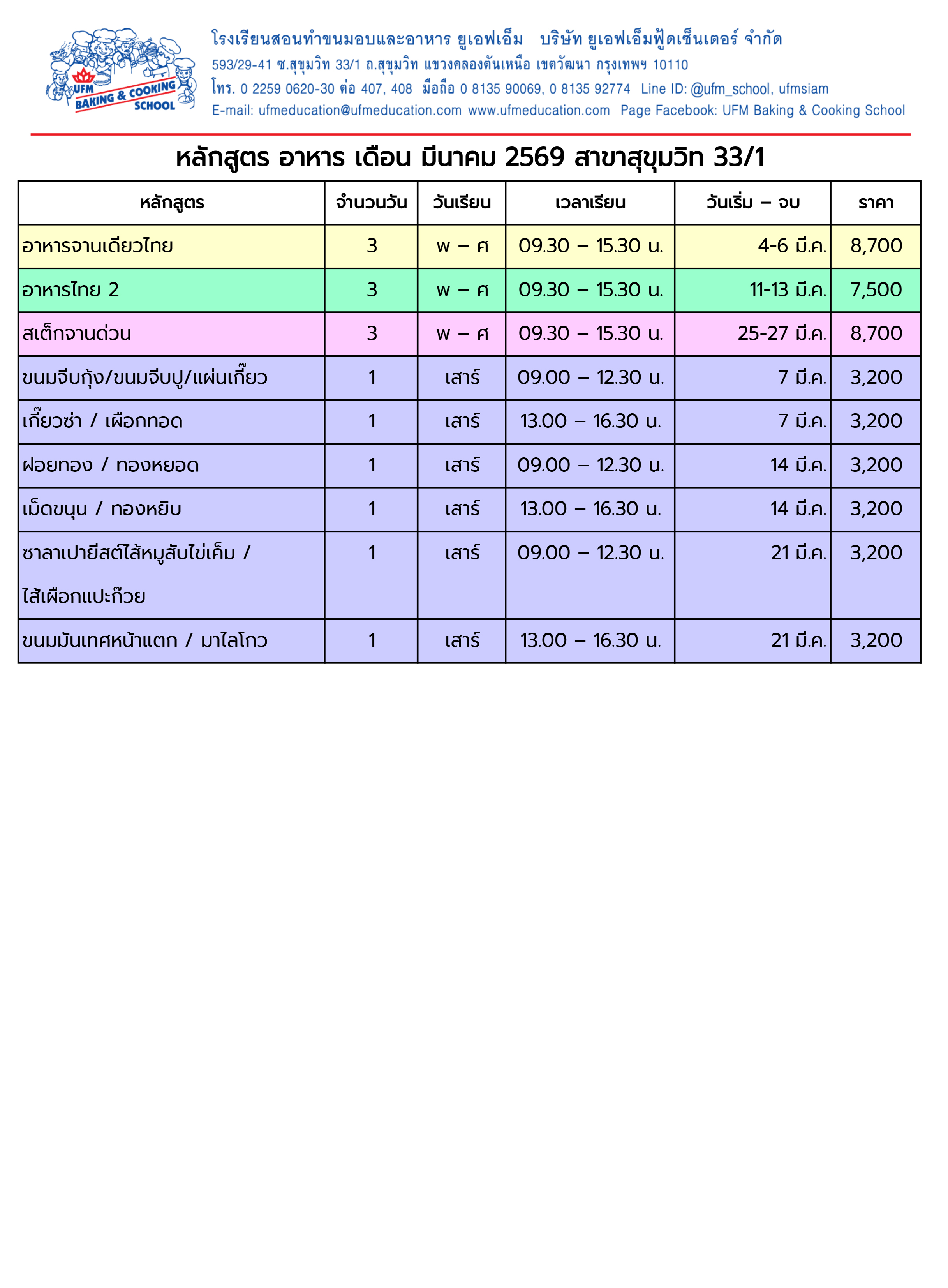 ตารางเรียน หลักสูตรอาหาร